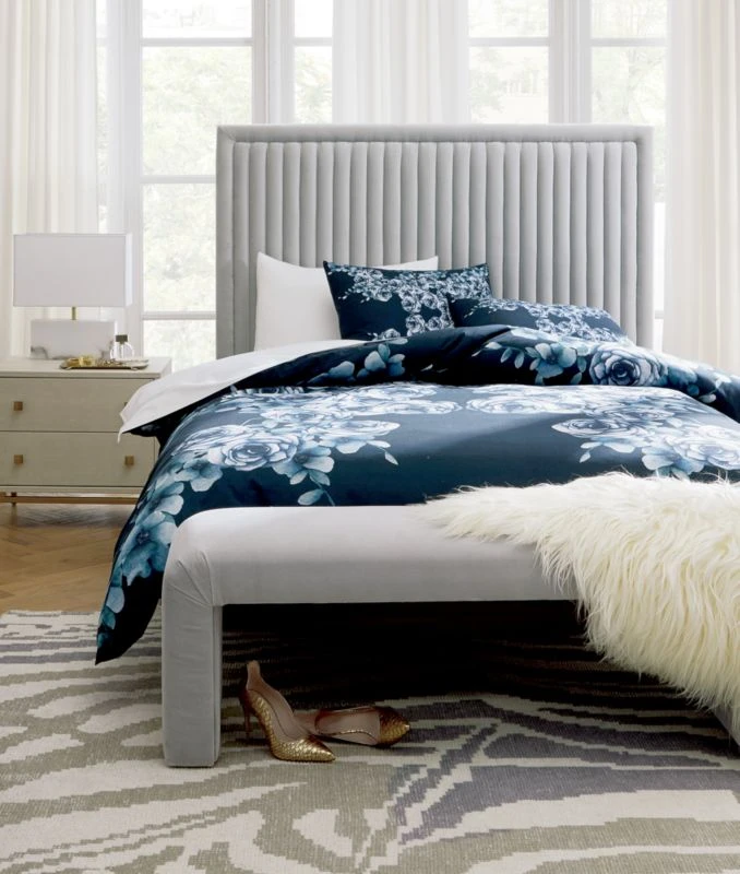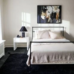 Divine ivory shagreen is boudoir-level luxury on a minimal modern frame. Designed by Amanda Ip of Slate Design, striking nightstand is completely wrapped in faux embossed sharkskin-like shagreen, by hand no less. Braced by a slim, open structure brass frame, silhouette is the picture of chic sophistication. Two deep drawers slide effortlessly on metal glides with brass-finished knobs. Learn about Amanda Ip on our blog. CB2 exclusive.
