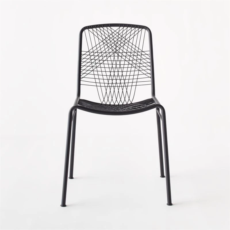 Iron frame with wire seat and back, expertly woven and welded into a graphic linear pattern. Finished in black, chair mixes beautifully with our wooden dining tables and desks. CB2 exclusive.