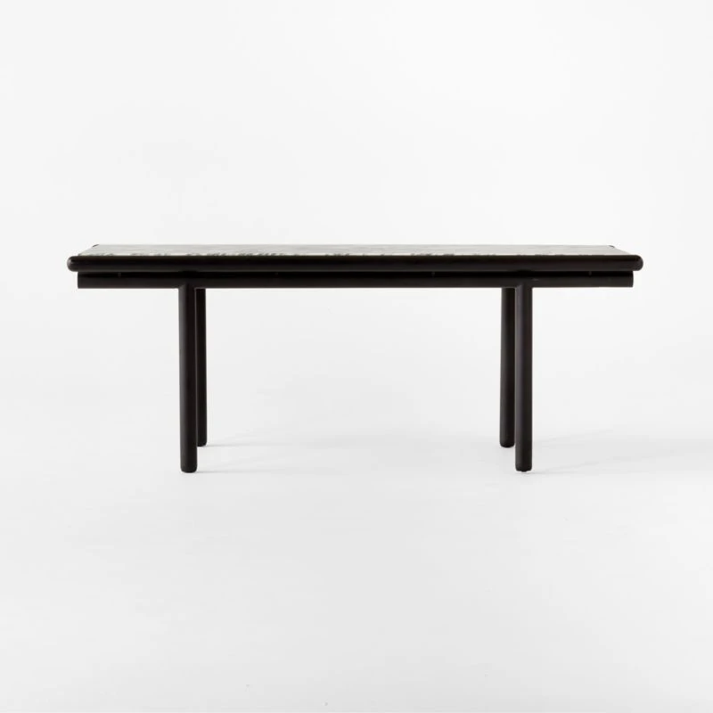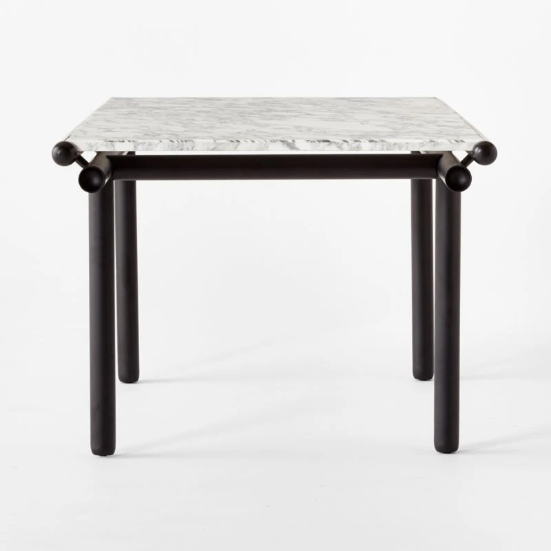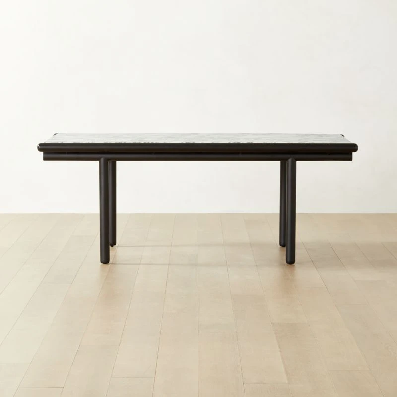 Based on an original Gianfranco Frattini design from 1985, this rectangular dining table is a tribute to Japanese woodworking techniques. Structurally complicated but striking in its simplicity, the sleek ebonized oak and iron tube base easily supports a tabletop of honed Italian Arabescato marble veneer. The ebonized ash wood on the base is lightly wire-brushed to emphasize the grain, making the table as beautiful up close as it is from a distance. CB2 exclusive.