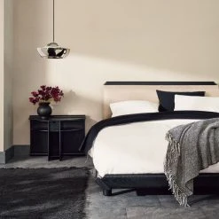 Hi-gloss white lacquer platform bed integrates headboard nightstands with two cantilevered shelves each—one wide for books, one narrow with discreet cord cutouts for your light/phone/alarm clock. Ledge extends around mattress and hovers over corner block feet. Headboard is just the right height for pillow propping, too. Learn about Mark Daniel on our blog. CB2 exclusive.