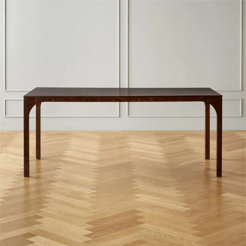 Ancient Roman aqueducts and high-speed trains are the inspiration behind this sleek, lacquered table from Euga Design Studio in Italy. Table flows continuously in dark Mappa burl veneer that nods to a vintage era. Fluid curve of each leg mirrors the sweeping, arched structure of the aqueducts—an architectural foundation for a stretch of Eurail tracks. Comfortably dines six, but will accommodate eight. Learn more about Euga Design Studio on our blog. CB2 exclusive.