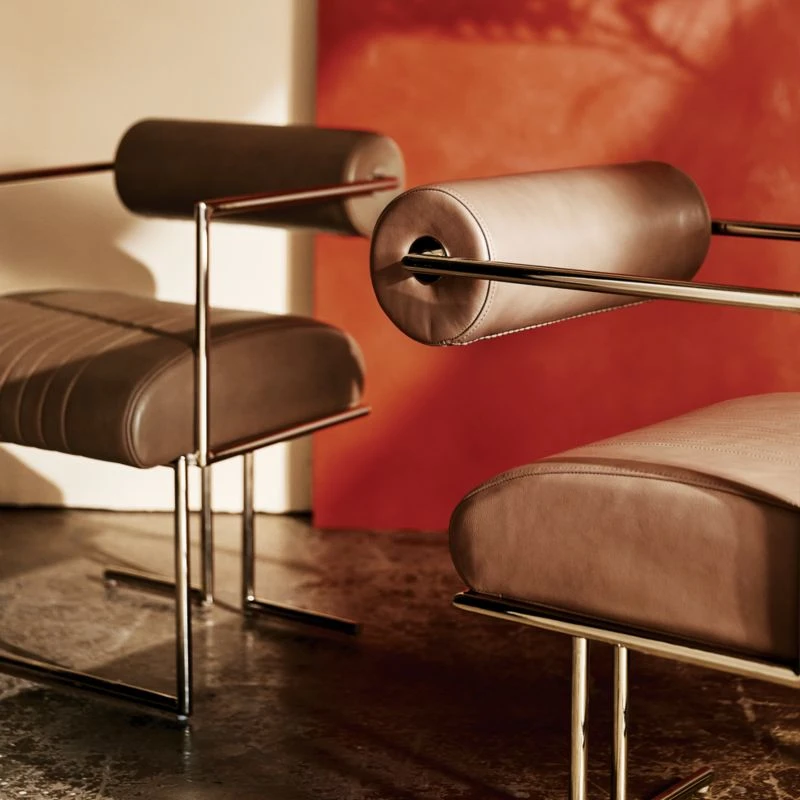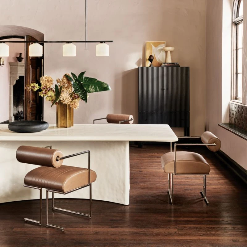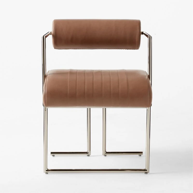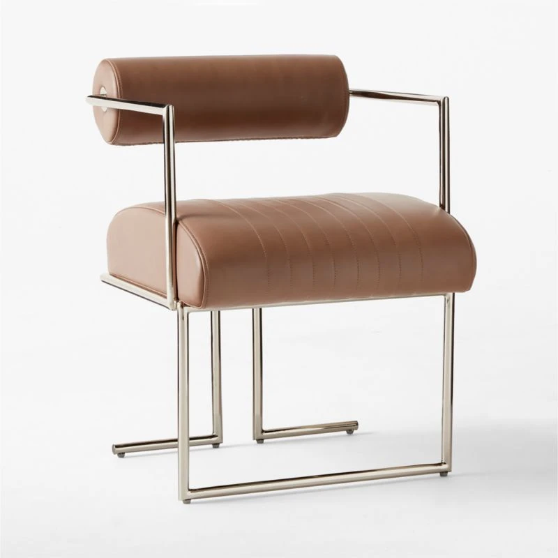 The classic neighborhood barbershop chair silhouette leaps from the ’60s to the present moment in Luam Melake’s bold dining chair design. Solid iron frame has a warm polished nickel finish that draws attention to its clean, decisive angles. A thick cylindrical backrest and channel-stitched seat, upholstered in luxe light brown Moore & Giles leather sourced from Italy, provide plush comfort for dinner parties and daily meals. CB2 exclusive.