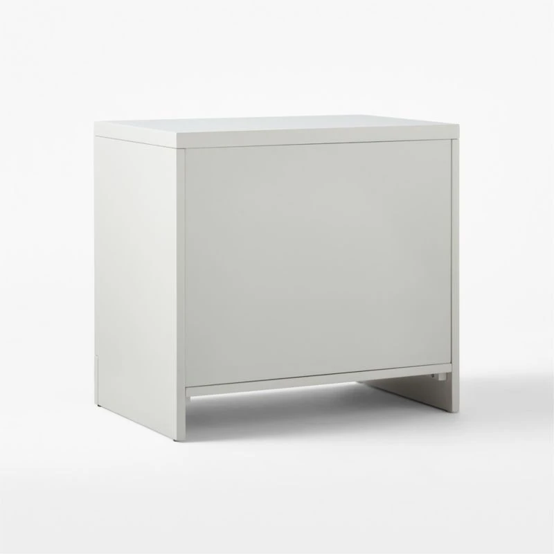 Designed by Brett Beldock, warm grey nightstand creates clean, sophisticated lines with a high-gloss lacquered finish. Channels of poplar wood certified sustainable by the Forest Stewardship Council ® front the single push-to-open drawer, adding a sculptural detail to complete the look. CB2 exclusive.