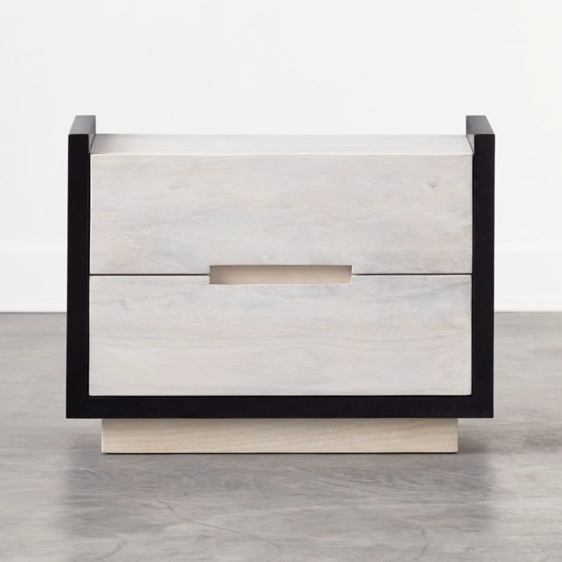 Designer Nicholas Obeid brings a graphic pop to the bedroom with this striking nightstand. Whitewashed solid acacia wood and base are framed in contrasting blackened mango wood. Two drawers provide ample storage. Learn about Nicholas Obeid on our blog. CB2 exclusive.