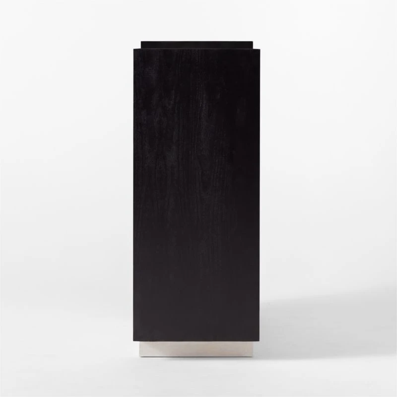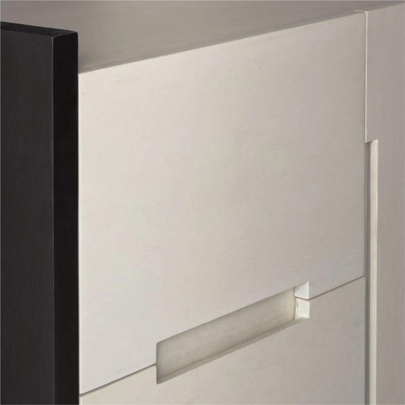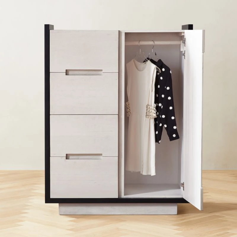 Designer Nicholas Obeid brings a graphic pop to the bedroom with this striking chifferobe. White washed solid acacia wood door and drawers are framed in contrasting blackened mango wood. Four drawers and a removable hanging bar inside the door provide ample storage. CB2 exclusive.