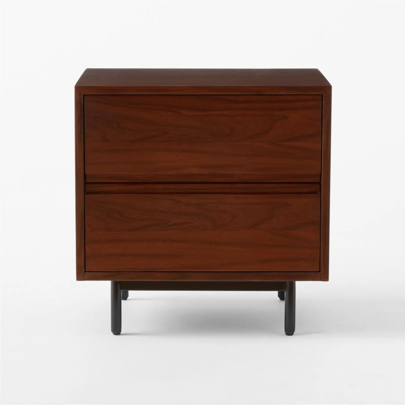 Sleek nightstand by VUUE wears its Brazilian modernist influences well. Clean-lined frame of solid mindi wood is graced with a faux rosewood veneer whose rich grain contrasts with cylindrical metal legs. Two soft-close, undermounted drawers glide smoothly to reveal ample room for bedtime essentials. CB2 exclusive.