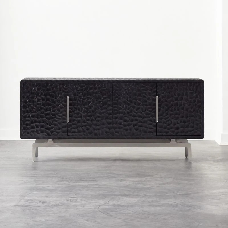 A showstopper of a credenza by Mermelada Estudio, deliberately designed to look as though it were carved out of one solid piece of wood. Blackened mango wood credenza is carved by hand to achieve the molded effect and sits on a solid stainless steel base. Cord management keeps things tidy. Learn about Mermelada Estudio on our blog. CB2 exclusive.