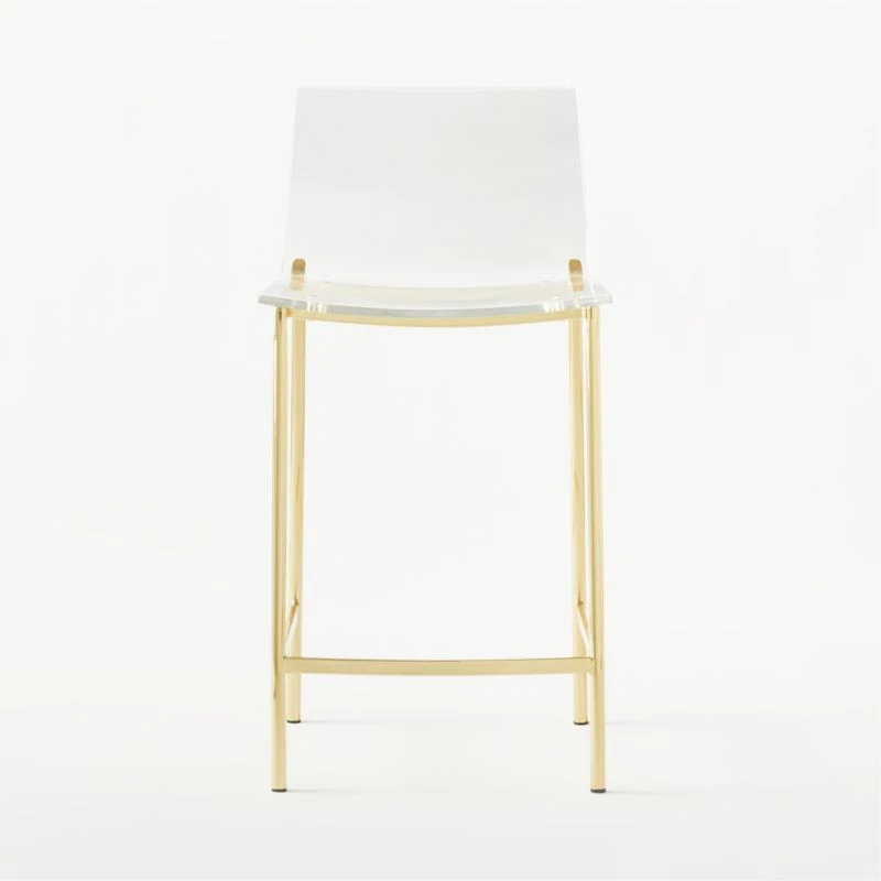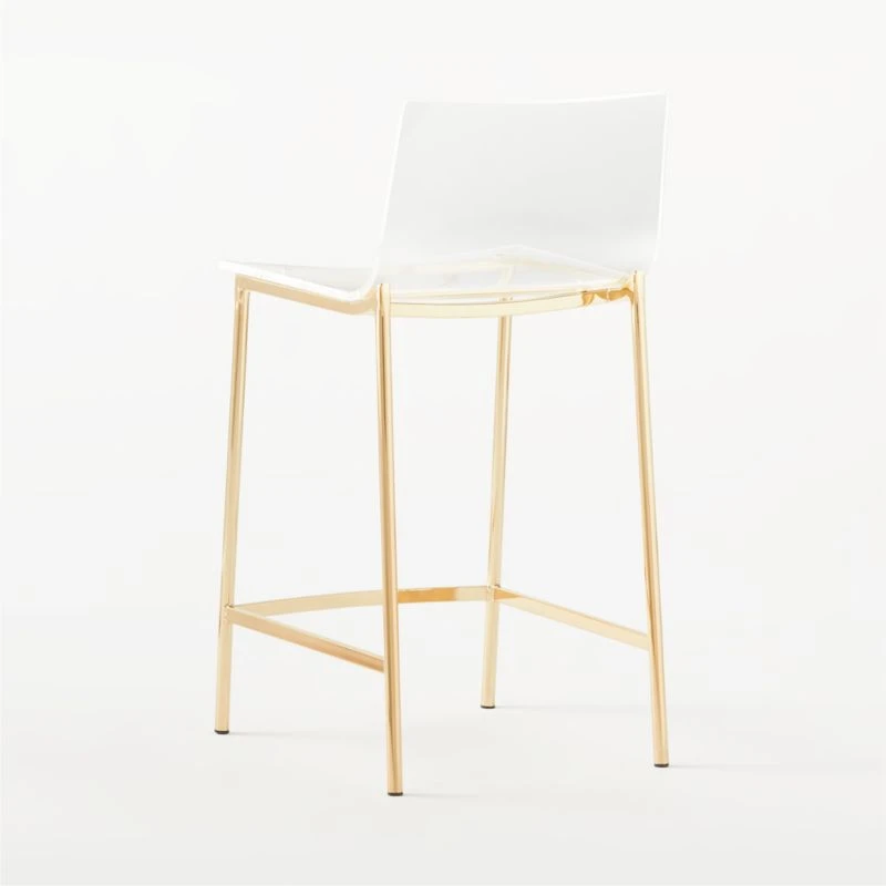A single piece of thick clear acrylic molds the seat of Mermelada Estudio’s barely-there bar stool. Elevated on thin gold-finished legs, airy stool is a clear choice for any modern kitchen. Learn more about Mermelada Estudio on our blog. CB2 exclusive.