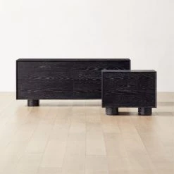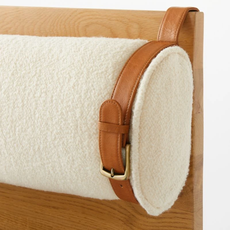 Exacting execution honors the handcrafted nature of California design duo Lawson-Fenning’s bed design. Solid white oak frame, certified sustainable by the Forest Stewardship Council ®, has a Craftsman-inspired cutout at the footboard. Headboard bolster, upholstered in ivory wool bouclé, is held in place by three removable saddle-leather straps with antiqued brass buckles—an accent both functional and decorative. CB2 exclusive.