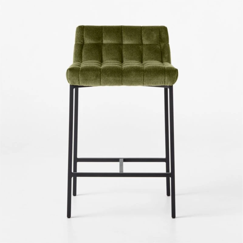 Jannis Ellenberger pairs a clean iron rod frame with a low back and tufted seat for this chic counter stool. Rich pesto green fabric is flecked with natural tones for a subtly luxe detail that adds visual interest. Ideal for kitchen island seating. CB2 exclusive.