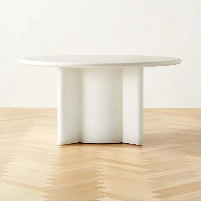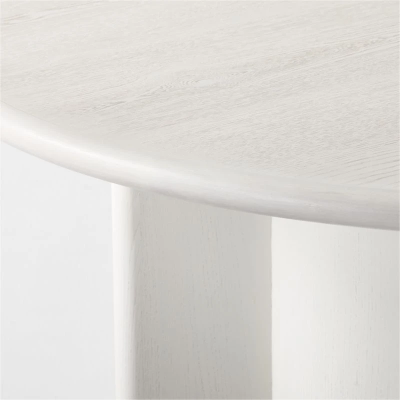 Designed in London by James Patterson, this large round wooden dining table is a testament to simplicity. Crafted with oak certified sustainable by the Forest Stewardship Council ® (FSC), its base and top have a white washed finish and smoothness that complement a range of interior styles. CB2 exclusive.