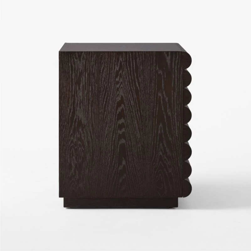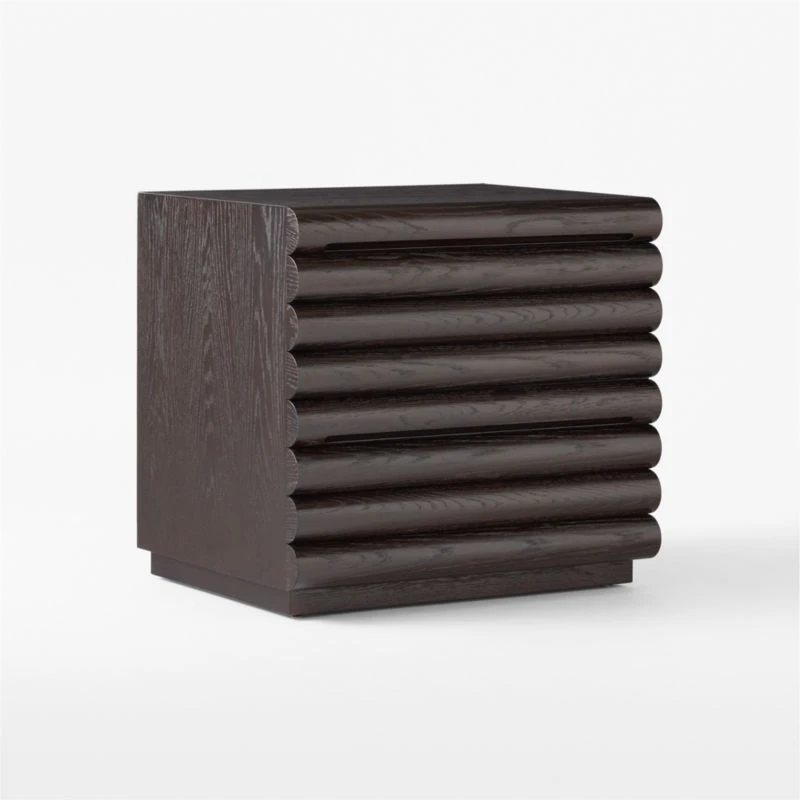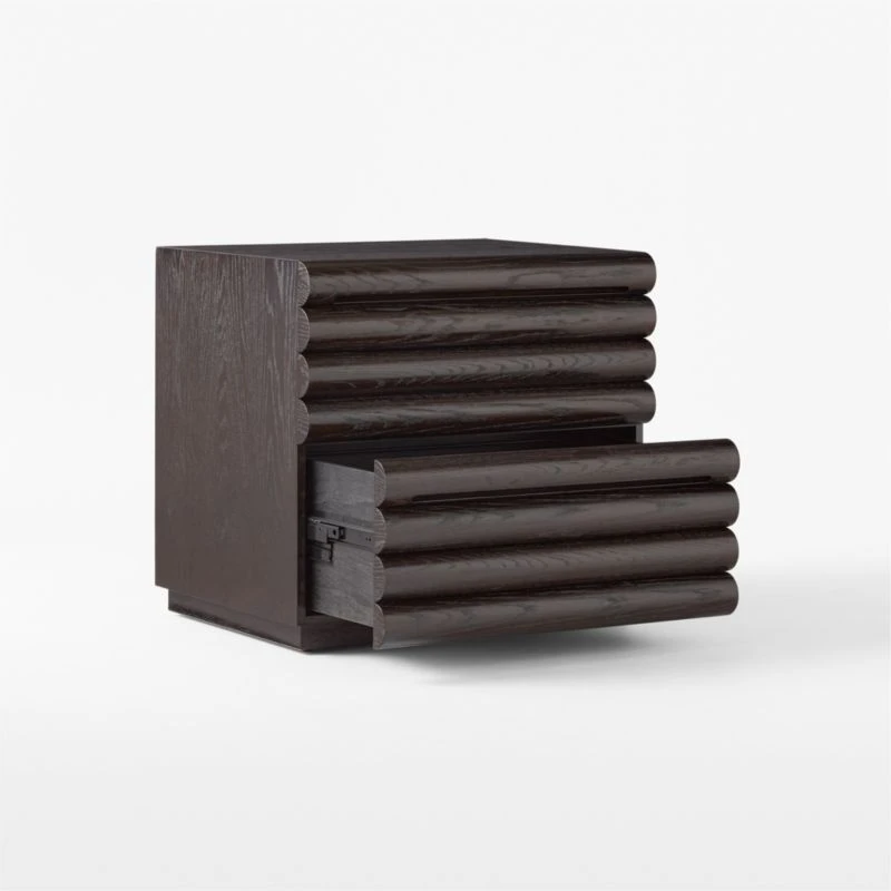 Barcelona-based Mermelada Estudio carves a channeled look into two-drawer file cabinet thanks to overexaggerated horizontal reeding. High-gloss, FSC ®-certified oak veneer in deep brown showcases visible graining. CB2 exclusive.