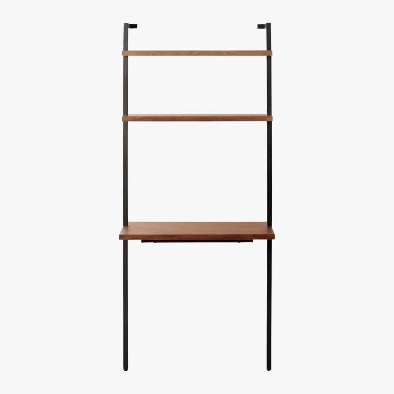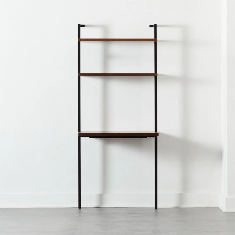 Party on top, business on the bottom. Three fixed walnut veneer shelves ladder up alongside a powdercoated metal frame and pull double duty as a display/work space. Modularly designed to save room and stand next to our matching Helix walnut bookcase. Stud mounting recommended; hardware included for drywall installation. CB2 exclusive.