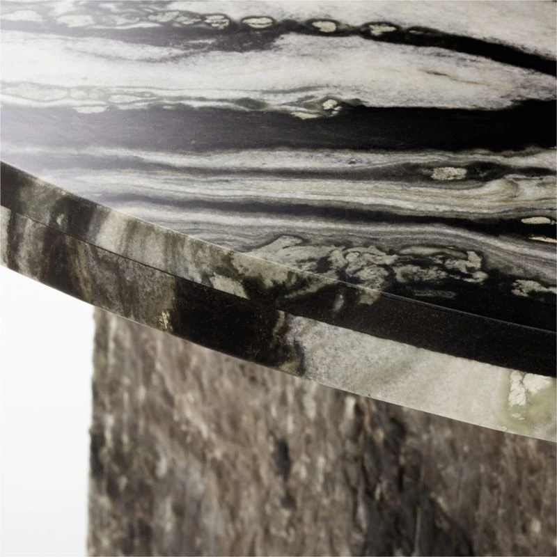 Graphic black and white Spider Marble with subtle green undertones defines this oval statement dining table by Brett Beldock. Half-cylinder legs are hand-chiseled on the outside for a raw finish. Legs may continue to chip over time, only adding to the beauty and uniqueness of the table. Honed marble tops the piece. CB2 exclusive.