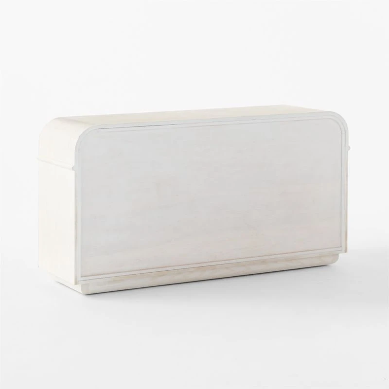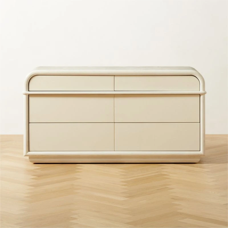 White wood dresser by Brett Beldock alludes to the ’80s with a curved silhouette, but its ivory nappa leather drawer fronts are pure modern luxury. Made with mindi wood, its push-to-open drawers on glides reveal abundant storage within. CB2 exclusive.