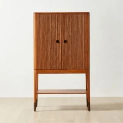 Designed in Italy by Veronica Balutto of Balutto Associati, this tall bar cabinet features hand-placed rattan reeds and a beautifully shaped mindi wood frame. Their warm brown finish is complemented by ringed door handles and antiqued metal detailing on the legs. Open the cabinet to reveal bottle storage, two removable glass shelves and two drawers with soft-close glides, providing abundant room for cocktail-hour essentials and extras. CB2 exclusive.