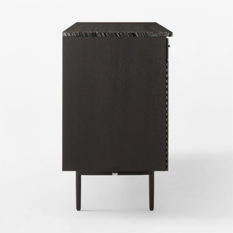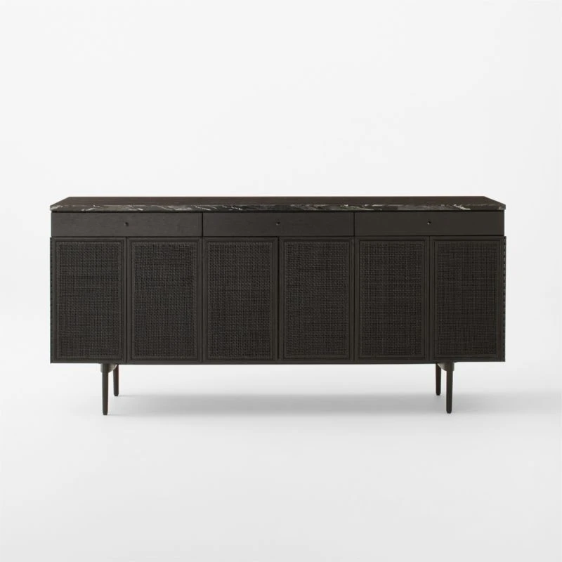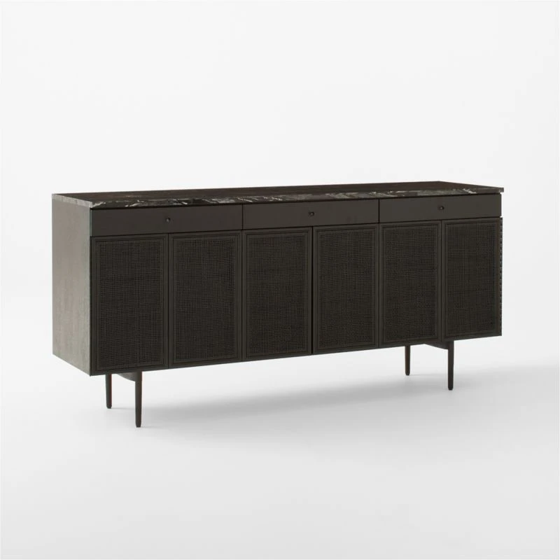 Originally manufactured in dark wood, the New England console is updated in painted black oak veneer, a polished Black Serpeggiante Marble top and black nickel hardware, but otherwise remains true to Paul McCobb’s design. Solid oak doors with cane fronts feature piano hinges that open to reveal six additional drawers, providing an abundance of storage for the living room, dining room or bedroom. CB2 exclusive.