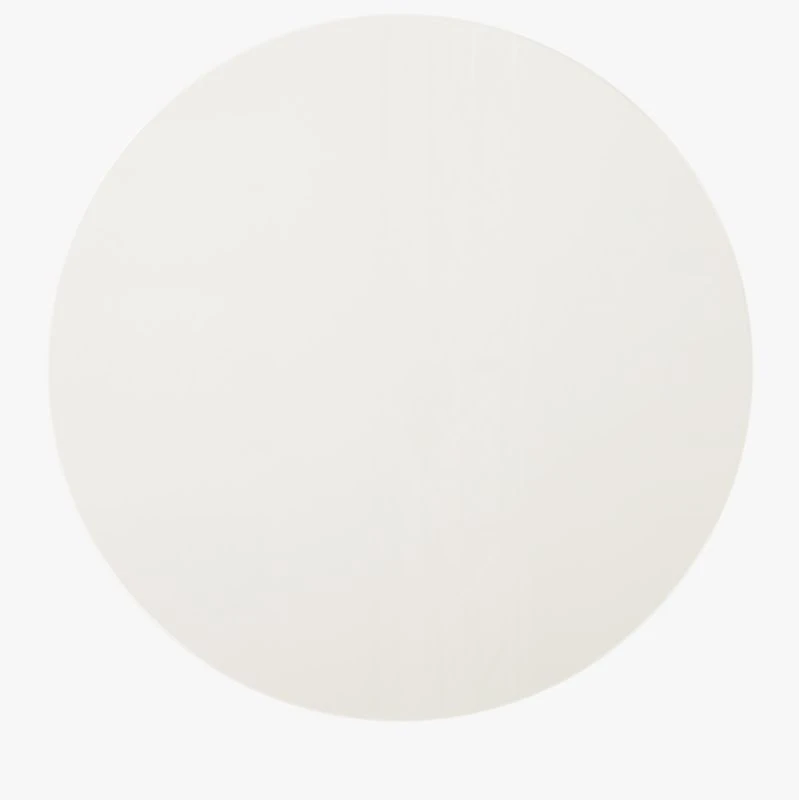 A sequel to our high styling, hardworking dining table for all your spaces: dining, kitchen, living, office. White lacquered wood composite disc, beveled at the edge, floats on a brass-plated metal pedestal that seems to emerge from the floor. CD of “Also Sprach Zarathustra” still not included. CB2 exclusive.
