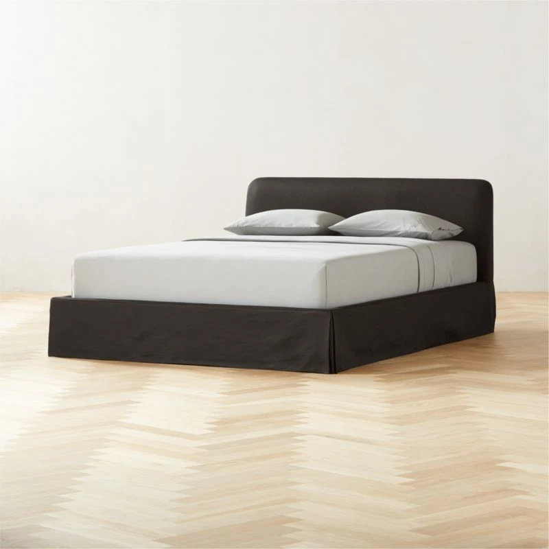 Beauty is in the details of this black bed by Kara Mann. One slipcover fits over the entire frame, draping it in luxe sateen. Perfectly tailored box pleats line the corners. “Even when something is simple, it’s those little details that can make it feel so special,” explains Kara. CB2 exclusive.