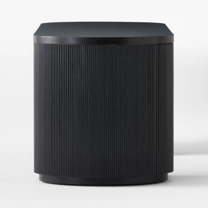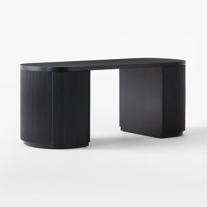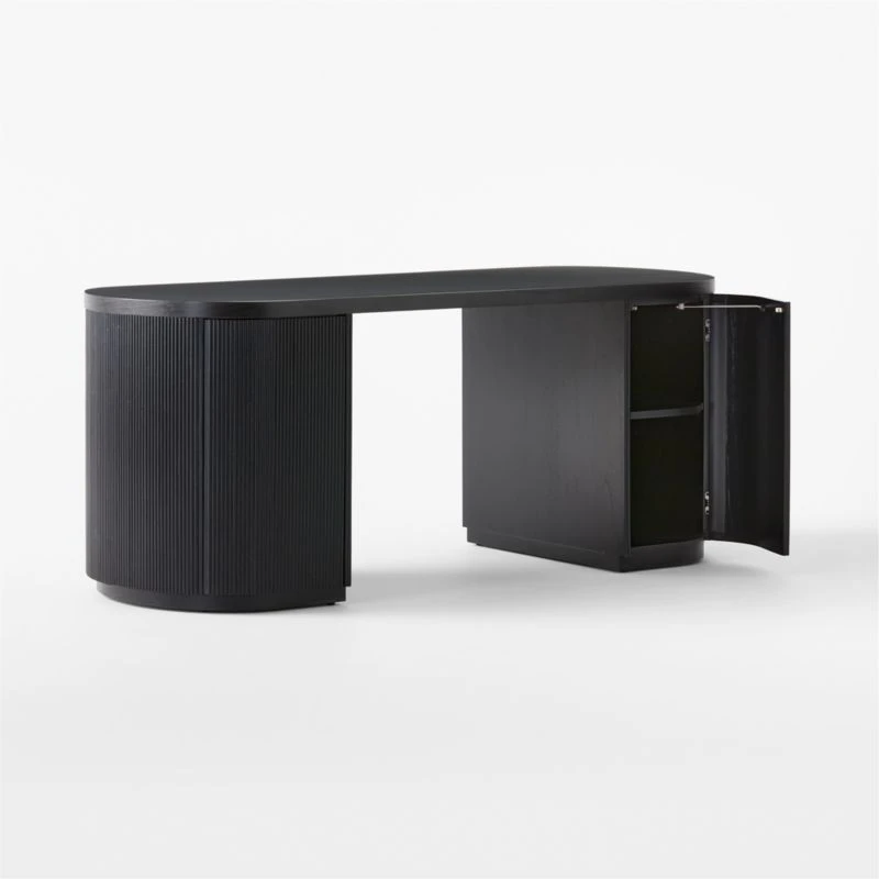 CEO of sophistication, brought to us by Mermelada Estudio. Modern, oversized executive desk in glossy ebonized oak rounds out on either side for maximum storage, one shelf per side. Push-to-open doors curve with the frame and are hidden beautifully with fluted repetition. CB2 exclusive.