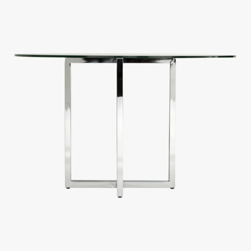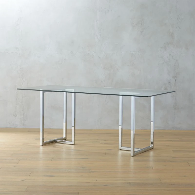 No lone rangers here. Two sleek chrome modern “sawhorses” partner with crisp, clean clear glass tops, rectangle or round—your choice. For more leg room and stability, turn the chrome-plated iron structures T-in at the ends (shown).