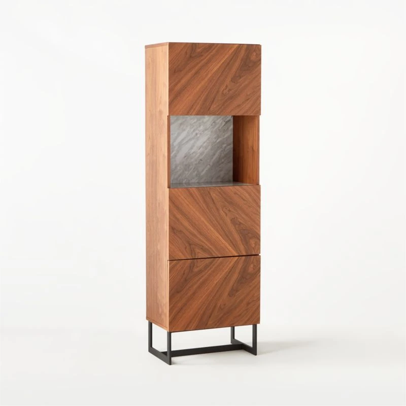 Designed by VUUE, warm walnut veneer frame stands tall with three cabinet doors that open to concealed storage. Precisely cut panels angle diagonally across each door to create an abstract chevron pattern of swirling grains and tones. Single open storage space, coolly defined by slabs of white Carrara-style marble on the shelf and in back, sits cabinet-height. Wood and marble cabinet chicly hides guilty-pleasure reads or serves strong drinks in the living room. Learn about VUUE on our blog. CB2 exclusive.