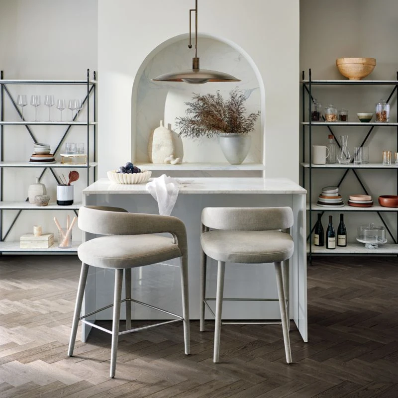 A center staple for any kitchen. Designed by Mark Daniel of Slate Design, hi-gloss white lacquered wood frame forms nooks and cubbies of all sizes for added kitchen storage. A large slab of honed white marble with grey veining tops the island, overhanging on one side for counter-height stools and chairs to pull up. Learn about Mark Daniel on our blog. CB2 exclusive.